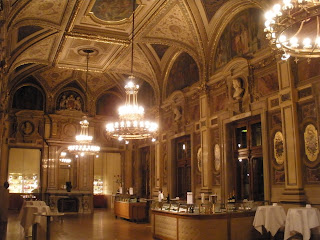 Later that night, after checking into our hostel, we headed to the opera. The Vienna State Opera is a beautiful building, even though the architect who designed it 130 years ago committed suicide after a negative critical reception. The building is a replica of the original, destroyed in WWII. Rather than pay the high price of the building tour, we took Rick Steves' trusty tourist advice and bought some of the 567 standing-room tickets for €3.50 to see the opera "Faust." The opera was in French, but there was a small screen in front of each seat (or standing area) offering a translation in other languages. I thought it was interesting reading mine in English, the screen in front of me in German and hearing French and kind of understanding all three. After a while, we decided about 45 minutes of standing (and opera) was enough and left. On our way out, we had the opera entrance all to ourselves for pictures of the stunning architecture. We decided to pass on the Opera Toilet Vienna Experience, a bathroom in the subway station outside the opera, playing "The Blue Danube" (as the sign says, "A Theatrical Ambience for Nature's Call"). The "experience" costs €0.60 (but the Burger King's bathroom was free).
